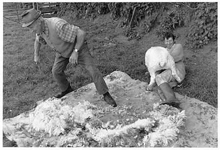 Charlie Mead and Derek Mortimore shearing a Greyface Dartmoor, Wonson, 1998