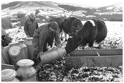Colin and David Slade giving water to their cattle, Isaford Farm, Widecombe, 1999