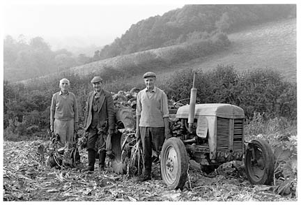Jack Lewis, Norman Mortimore and Will Webber harvesting 'mangels', Murchington, 1986