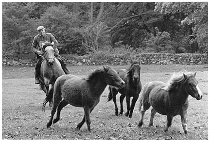 Cyril Abel rounding up ponies at Moortown Farm, Whitchurch, 1978