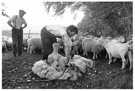 Alf Setter (standing) and Richard Leaman power shearing on Washford Hill, Chagford 1979