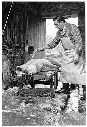 'Zachy' Mortimore scalding a pig, Batworthy Farm, Chagford, 1979