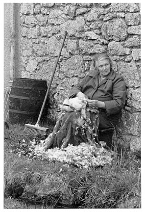 Annie Harvey plucking a fowl for dinner, Batworthy Farm, Chagford, 1980