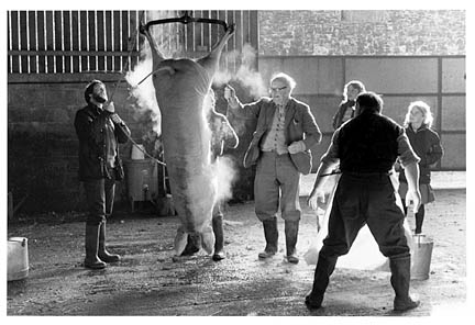 Hoisting the pig, Bowden Farm, Drewsteignton, 1983