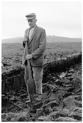 Tom Endacott of North Creaber cutting peat, Gidleigh Common, 1983