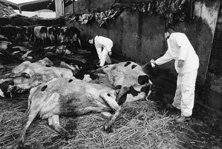 Spreying the cow carcasses with dye.